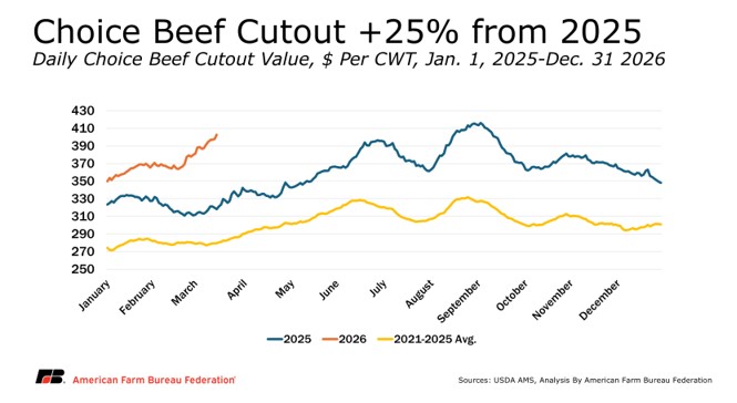 Memorial Day is considered the unofficial start of grilling season, which typically brings peak seasonal demand for beef. March and April usually bring peak demand for other proteins such as ham and lamb, while beef demand slows. This year, demand for beef has risen over the last several weeks, pulling prices higher at a much faster pace than in past years. Since January, the choice beef cutout value has increased by $50.14/cwt or 13%, from $349.97/cwt on Jan. 2, 2026, to $400.11/cwt on March 20, 2026. This is 25% higher than 2025 and has many analysts questioning if the strong demand from grilling season will pull beef prices even higher this summer.